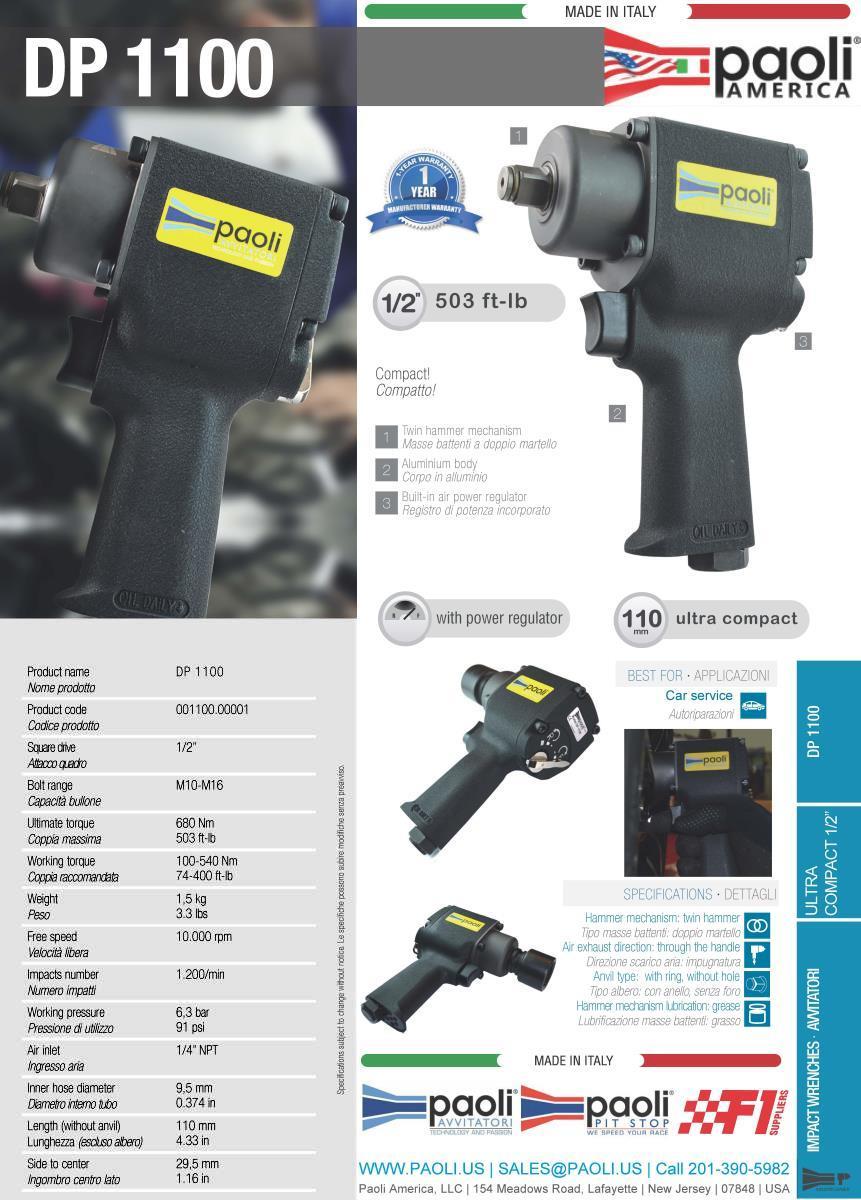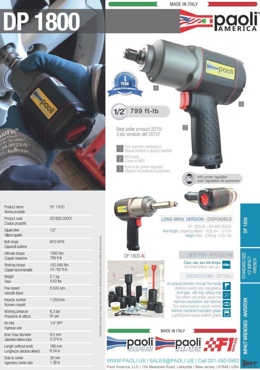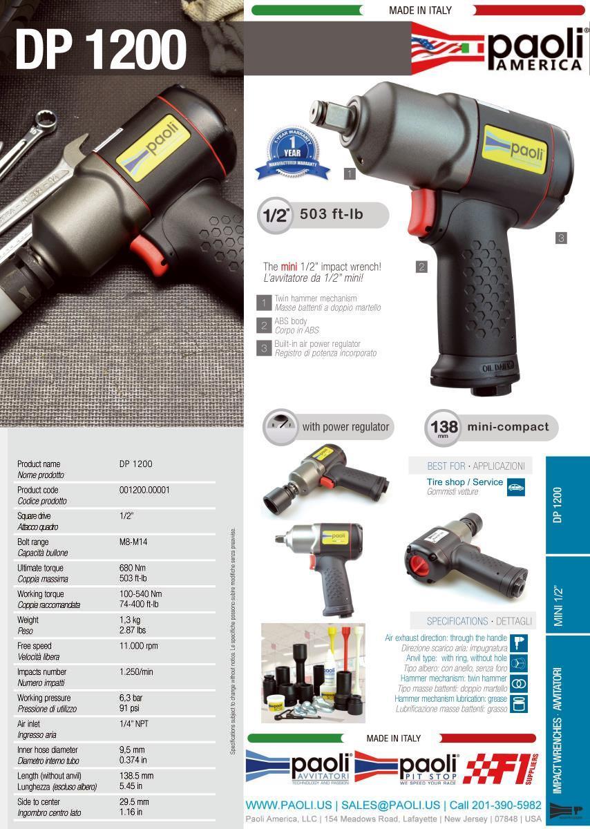Dino Paoli offers 13 different models of racing wheel guns and 32 automotive and industrial models of impact wrenches. Many models are available with medium and long anvil sub-